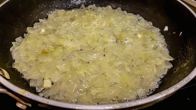 - Snijd een ui in kleine blokjes en bak ze zacht in olie. Dit duurt 5-7 minuten. Leg fijngehakte wortelen op de ui en kook de groenten samen nog 5-7 minuten.