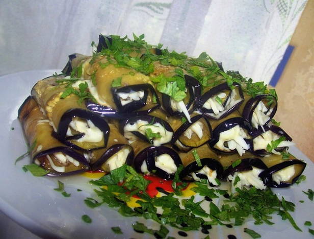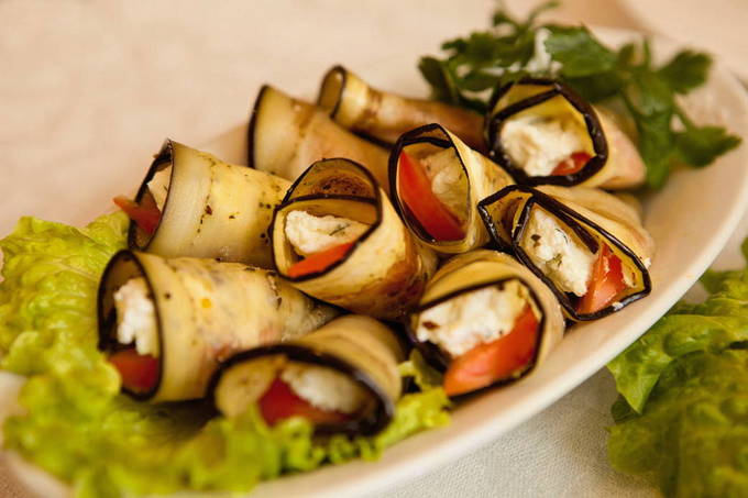 - Leg op elk stuk aubergine een beetje kaas- en knoflookvulling, dan een stuk tomaat en rol het op. Het afgewerkte voorgerecht moet in de koelkast worden bewaard om te trekken, en vervolgens gegarneerd met kruiden en geserveerd.