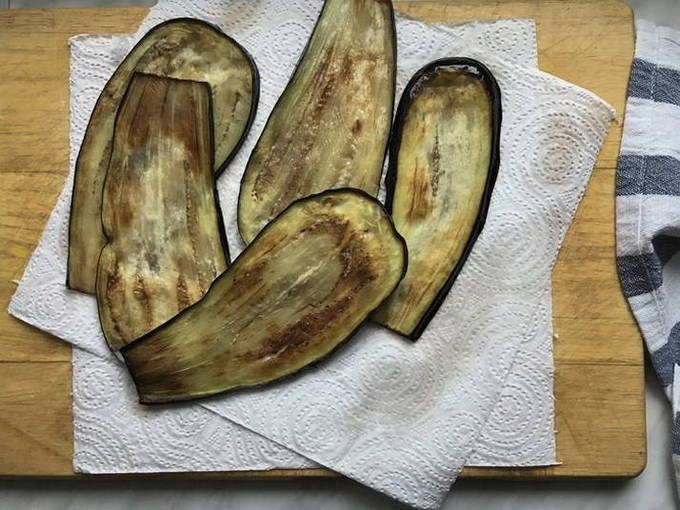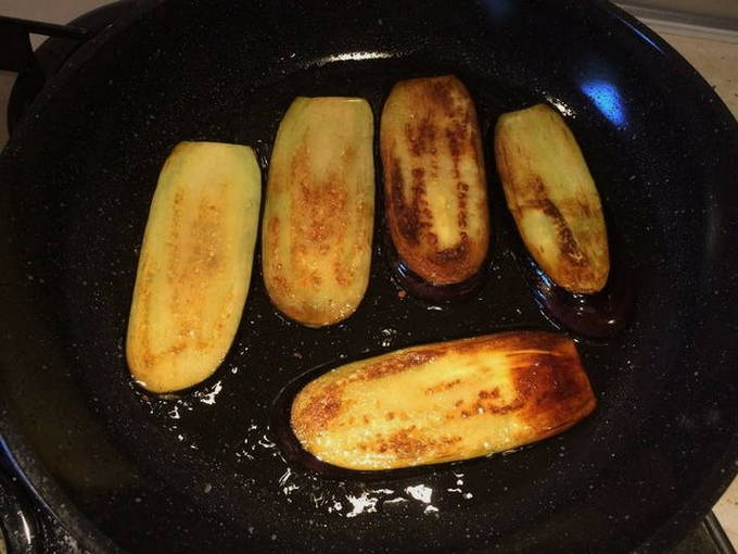 - De aubergines worden gewassen, gedroogd met keukenpapier en in olie gebakken tot ze aan beide kanten bruin zijn. Verspreid vervolgens op een servet om overtollig vet te verwijderen.