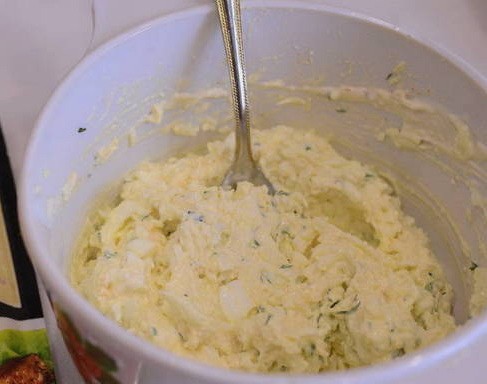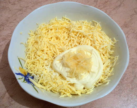 - Van harde kaas wordt schaafsel gemaakt, feta wordt fijngehakt tot kruimels, vermengd met gehakte knoflook en mayonaise. Breng indien nodig op smaak, extra zout en peper.