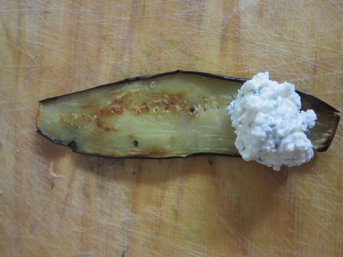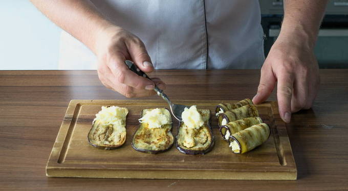- Leg de vulling op de ongekoelde aubergineplakken, zodat de kaas een beetje kan smelten en de knoflook zijn volle aroma kan onthullen.