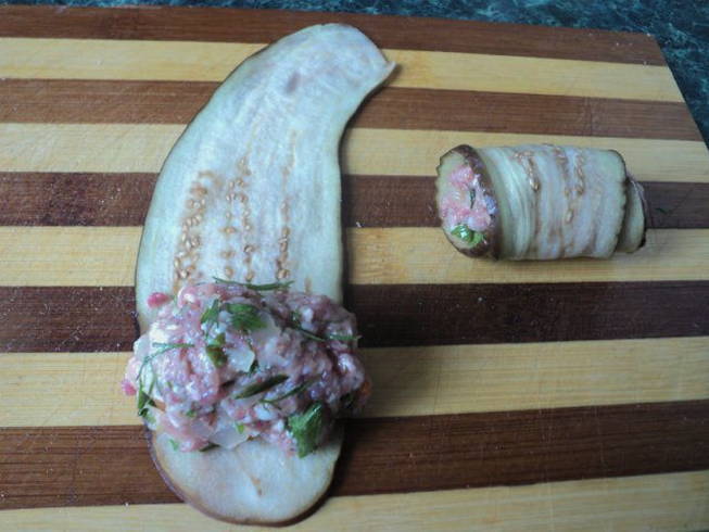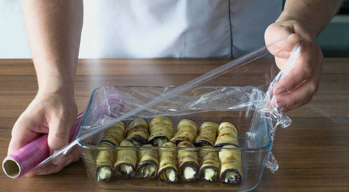 - Smeer een beetje vulling op een plak aubergine en rol deze op tot een rol. De blanco's worden gevouwen tot een diepe glazen schaal of kookpan.