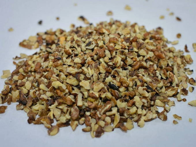 - Walnoten worden 4-5 minuten in een droge koekenpan gecalcineerd en afgekoeld en vervolgens tot kruimels vermalen. Het is handig om dit in een vijzel of blender te doen.