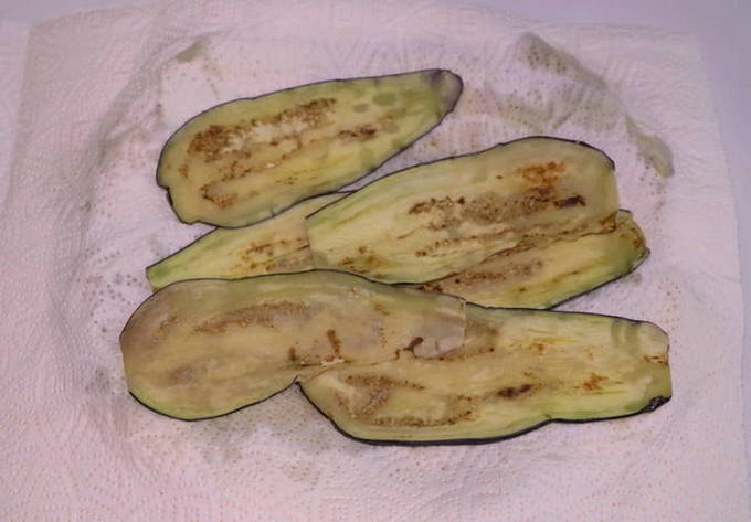 - Aubergineplakken worden 3-5 minuten aan elke kant in olie gebakken om een gebruinde korst te creëren, en vervolgens uitgespreid op een papieren handdoek om overtollig vet te verwijderen.