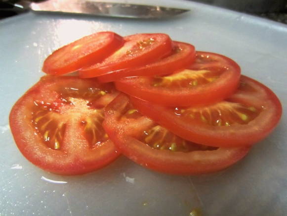 - Snijd de tomaten in dunne plakjes.