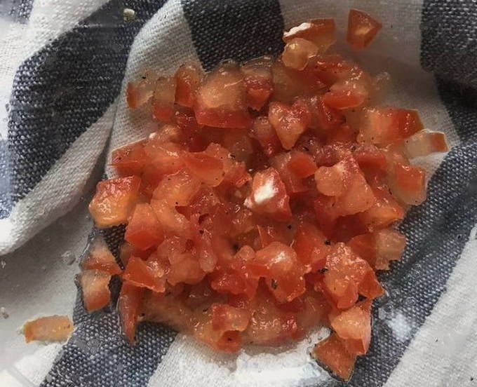 - De tomaat wordt ontpit met zaden, het vruchtvlees wordt in zelfs kleine blokjes gesneden.
