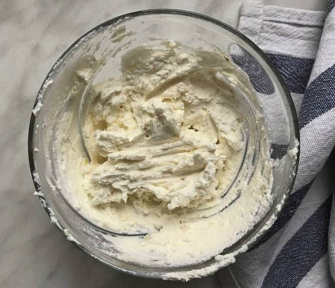 - Geschaafde kaas wordt gemengd met gepureerde kwark, gehakte kruiden en knoflook, op smaak gebracht met zout en zwarte peper.