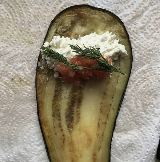 - Verspreid voor elke voorbereide plak aubergine de vulling, een beetje tomaat en gehakte dille. Oprollen en in een geschikte container doen.