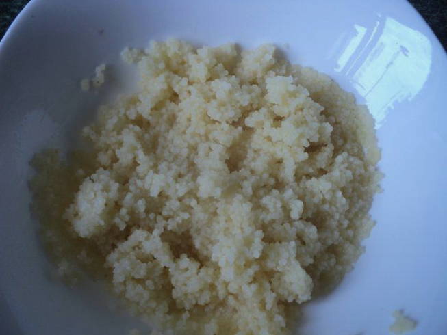 - Giet in een aparte kom kokend water over de couscous en laat 5 minuten trekken.