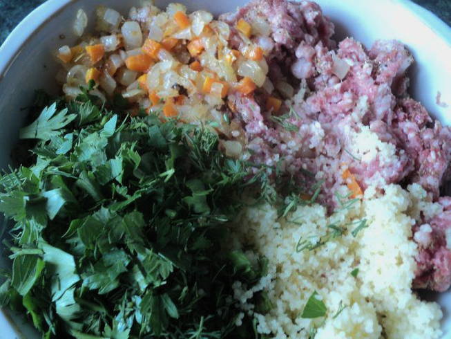 - Meng in een diepe kom het gehakt, couscous, gebruinde groenten, gehakte kruiden, specerijen, zout en peper. Kneed de resulterende vulling goed door.