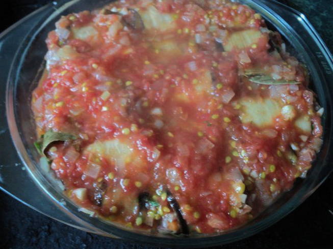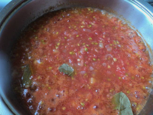- Voor het gieten wordt de resterende ui gesneden en gebakken in olie, fijn geraspte tomaten, suiker, een beetje zout en laurier worden daar toegevoegd.
