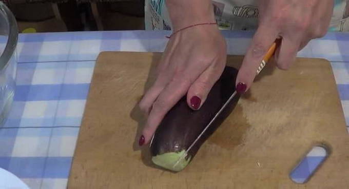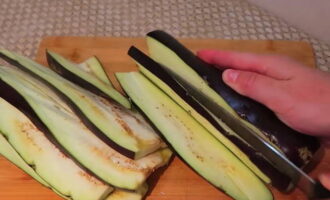 - Snijd de gewassen aubergines in dunne langsreepjes. De dikte van elke plak mag niet groter zijn dan 5 mm, anders wordt het moeilijk om ze op een rol te rollen.