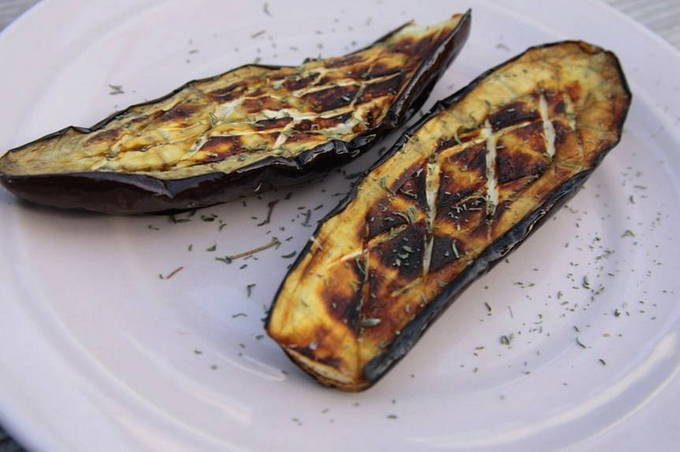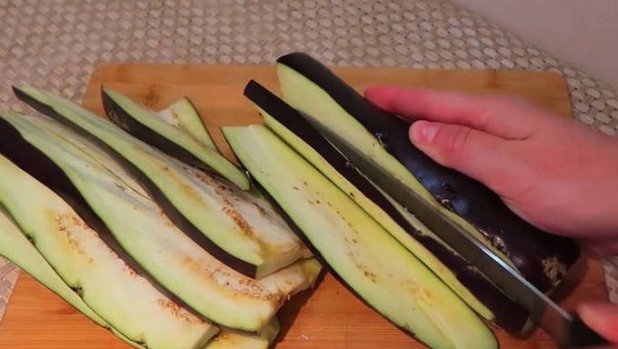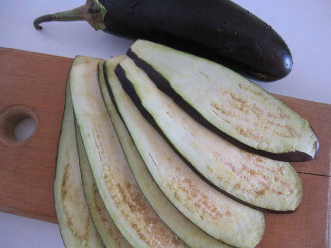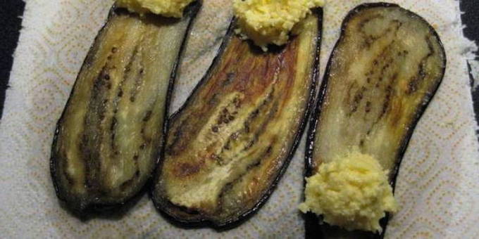 - Aubergines worden in dunne langwerpige plakjes gesneden, aan beide kanten ingevet met plantaardige olie en in een pan goudbruin gebakken. Vervolgens worden ze op een hard oppervlak gelegd en gekoeld.