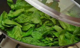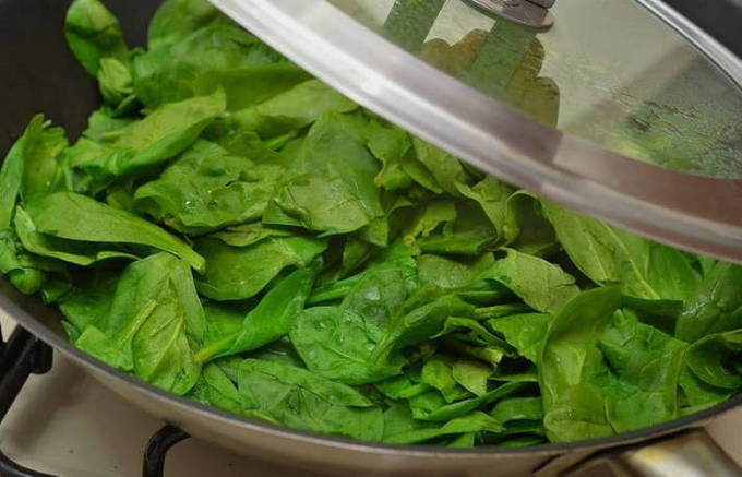 Meng in een diepe kom spinazie en brul, voeg fijngehakte knoflook toe, breek een ei, voeg de helft van het volume fijngehakte mozzarella en de helft van de schaafsel Parmezaanse kaas toe. De massa wordt gemengd en op smaak gebracht, op smaak gebracht met de juiste hoeveelheid peper en zout en ook met een mengsel van Italiaanse kruiden.