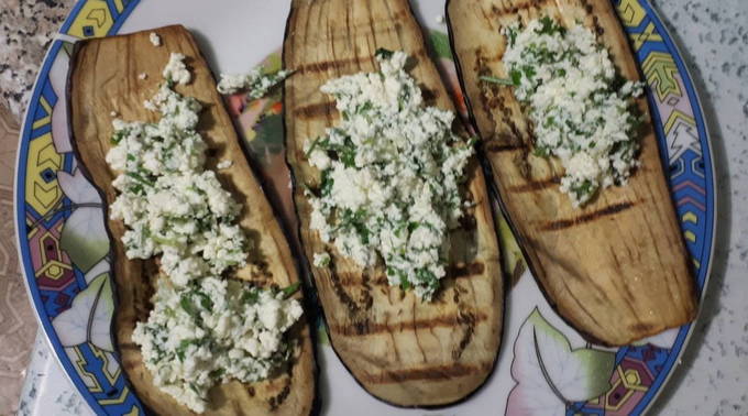 - Auberginerolletjes met kaas en knoflook, gebakken in een pan