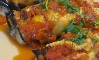 Op elk bord aubergine wordt een vulling geplaatst en er wordt een rol gevormd. Bereide halffabrikaten worden strak tegen elkaar gelegd in een ovenschaal met saus, met de rest van de marinara erop gegoten en bestrooid met de rest van de mozzarella en parmezaanse kaas.