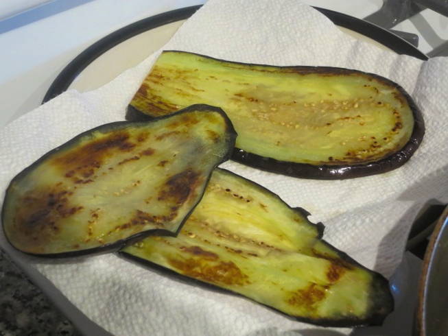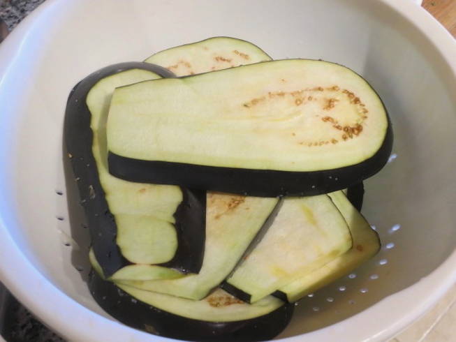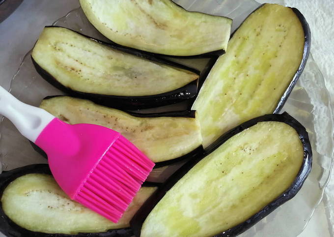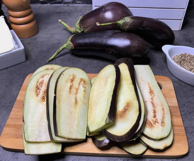 - De aubergines worden gewassen, de uiteinden verwijderd en in de lengte in dunne plakjes gesneden. Bestrooi met zout en laat een half uur staan. Daarna worden de resten van het zout en het vrijgekomen sap eraf gewassen, uitgeperst en gedroogd de plakjes groenten.