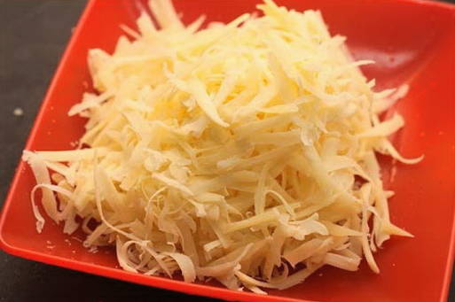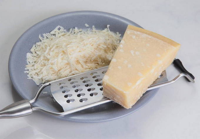 - Maal de kaas op dezelfde manier. Als u een meer delicate consistentie wilt, is het beter om de kaas op een fijnere rasp te raspen.