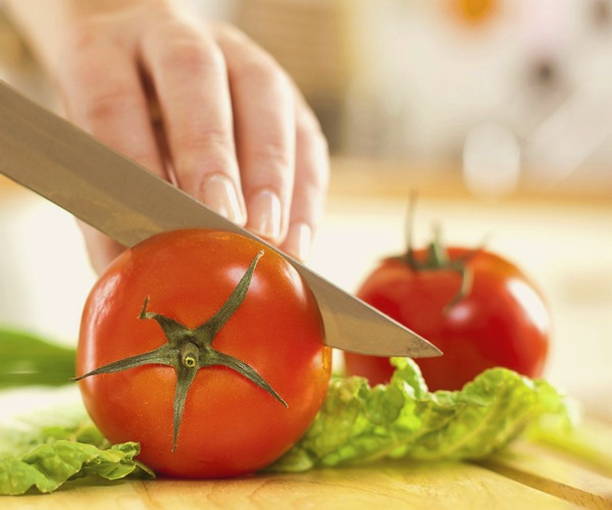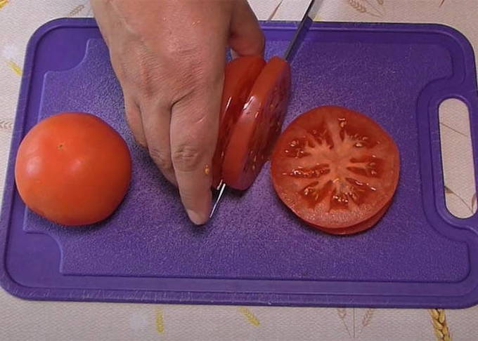 - Tomaten worden in dunne plakjes gesneden.