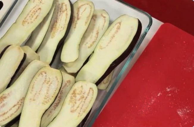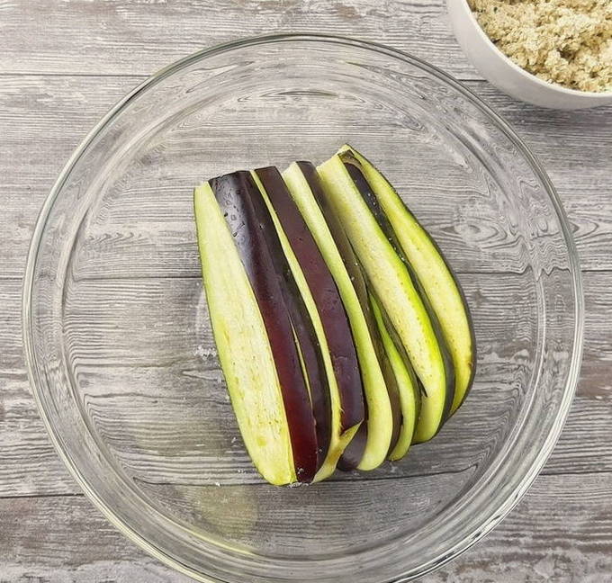 - Verdeel de gewassen aubergines in plakjes en doe ze in een diepe kom, giet 20 minuten met gezouten water. Giet vervolgens het water af en droog de groenteplakken met een handdoek.