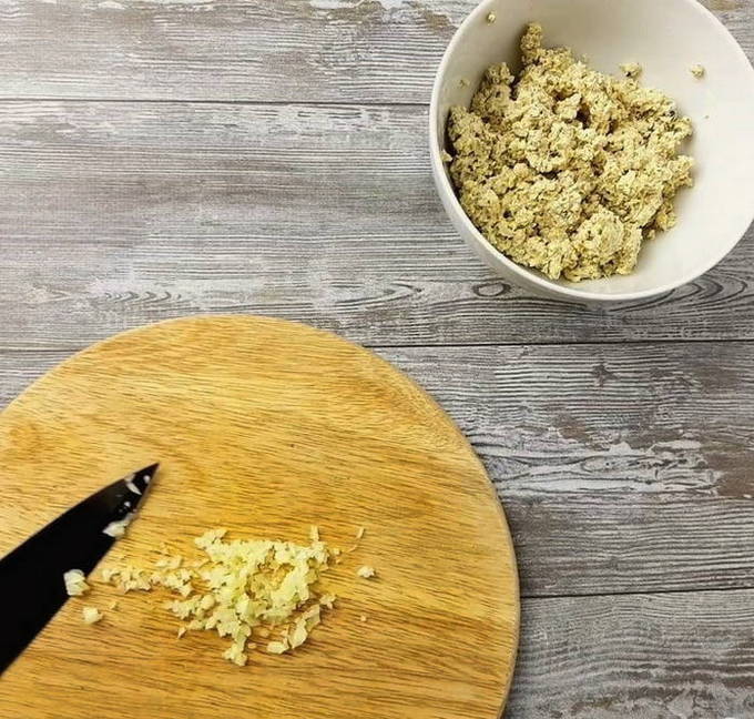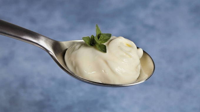 - Mayonaise wordt gemengd met gehakte knoflook en geraspte kaas.