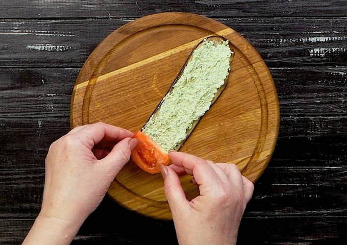 - Leg de kaasvulling, wat tomaten in de iets afgekoelde aubergines en vorm er rolletjes van. Leg het kant-en-klare voorgerecht op een schaal, garneer met kruiden en stukjes walnoot.