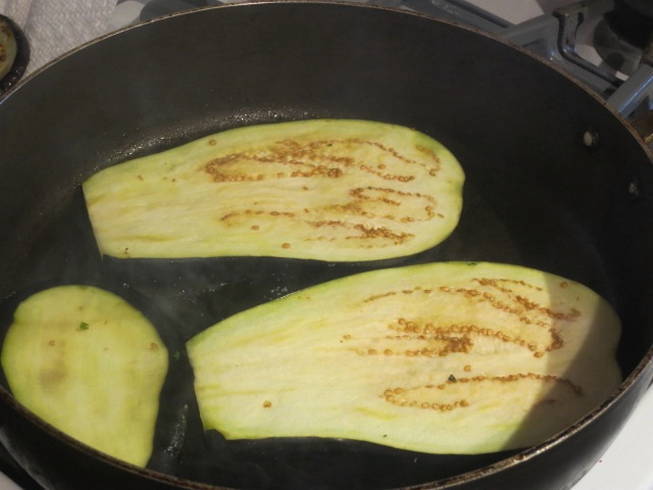 Auberginerolletjes met kaas en knoflook, gebakken in een pan