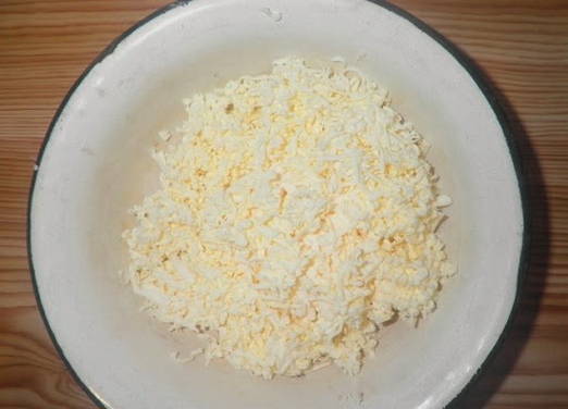 - Kaasschaafsel wordt gemengd met geraspte eieren, gehakte knoflook en mayonaise worden toegevoegd. Indien nodig wordt de vulling gezouten.