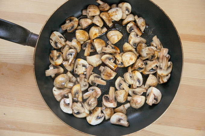 - Fruit de ui in een diepe koekenpan, doe dan de champignons en bak alles samen tot de champignons gaar zijn. Breng op smaak met zout en peper de resulterende paddenstoelenmassa.