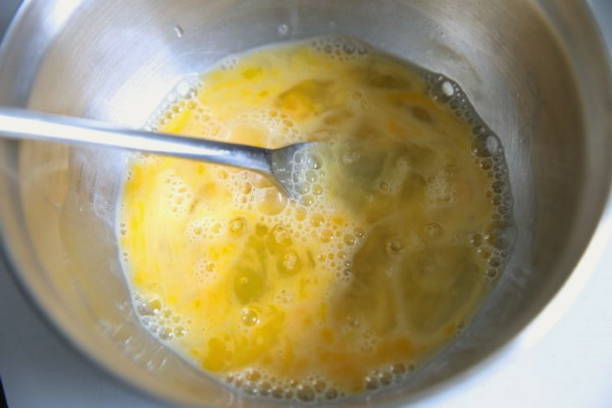 - Klop het ei in een diepe kom met een mixer, garde of vork.