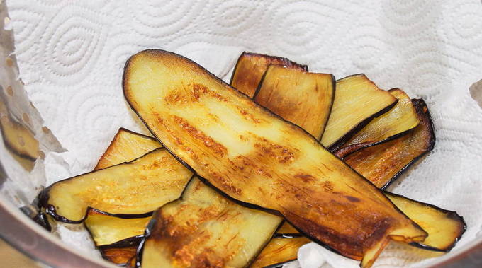 - Stukjes aubergine worden gebakken in een pan met plantaardige olie, zodat er aan beide kanten een gouden korst verschijnt, en vervolgens uitgespreid op een papieren handdoek om overtollig vet te verwijderen.