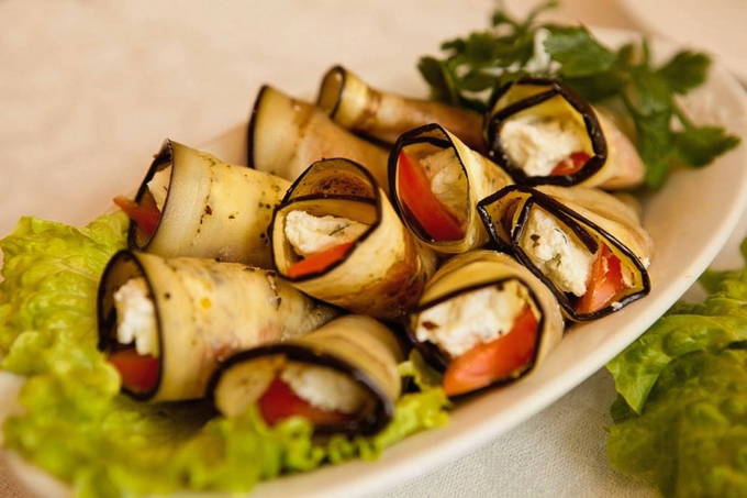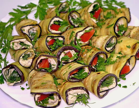 - Elke plak aubergine wordt besmeerd met mayonaise-kaassaus, een plak tomaat wordt uitgelegd en opgerold tot een rol. Het gerecht wordt gekoeld geserveerd.