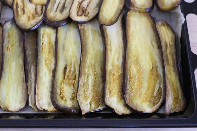 - Verdeel de aubergines in de lengte in dunne plakjes, vet ze in met olie, bestrooi ze met zout en bak ze ongeveer 10 minuten in de oven.