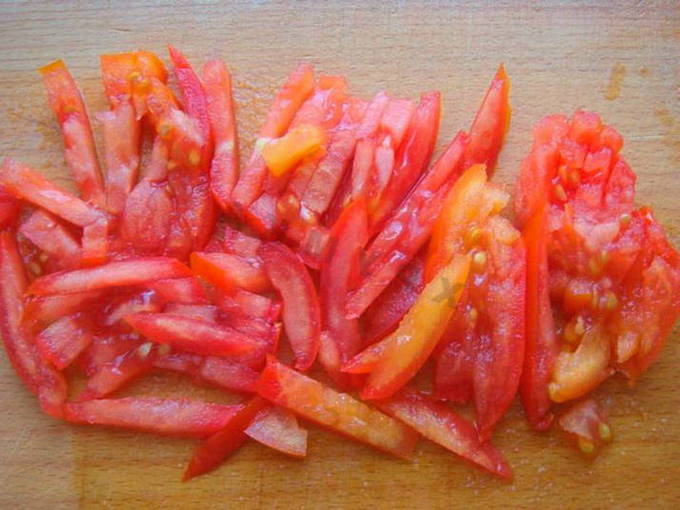 - Snijd de tomaten in blokjes of kleine plakjes.