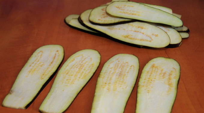 - De staarten van gewassen aubergines worden verwijderd en in de lengte gesneden tot 5 mm dik.