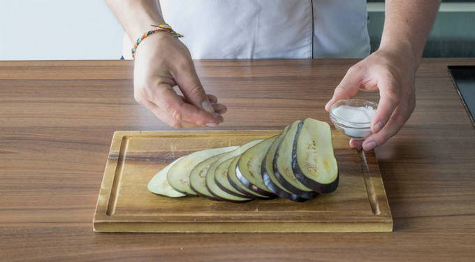 - De gewassen aubergines worden in plakjes van niet meer dan 5 mm dik gesneden en 20 minuten gevouwen, bestrooid met zout, in een bak.