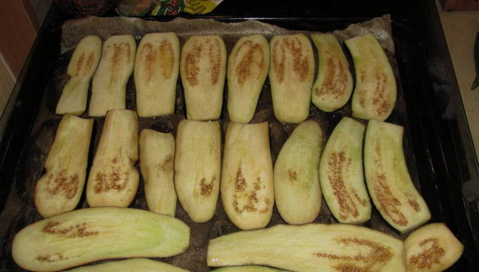 - Aubergineplakken worden gewassen, uit overtollig vocht geperst en in olie gebakken totdat ze een aangename gouden tint krijgen. Overtollig vet wordt verwijderd met keukenpapier of handdoeken.
