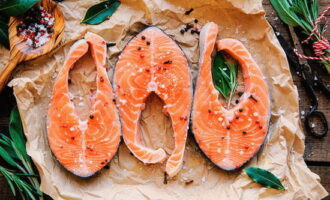 Bestrooi de stukjes vis met zout, een mengsel van versgemalen peper, bestrijk met olijfolie en besprenkel met het sap van een halve citroen. Dek de steaks af met plasticfolie en laat 10-15 minuten marineren.