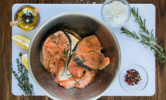 - Maak een marinade van boter, specerijen, kruiden en suiker, wrijf de vis er aan alle kanten mee in, laat 15 minuten staan. Het is belangrijk om de vis in dit stadium niet te zouten om hem tijdens het koken niet uit te drogen.
