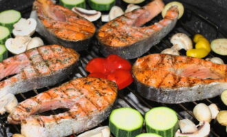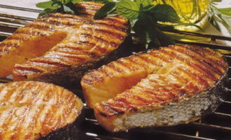 - Leg de vis op een ingevet rooster en kook op houtskool tot hij gaar is. Als de steaks rode vis zijn, is het voldoende om niet langer dan 5 minuten aan elke kant te bakken. Als witvis gemarineerd is - 10-15 minuten aan verschillende kanten.