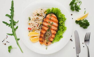 Gegrilde rode vissteaks worden geserveerd met kruiden, verse groenten en een halve citroen. Genieten van!