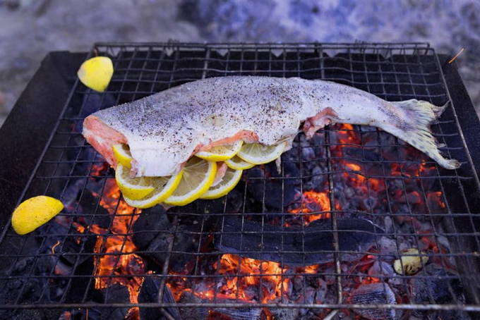 - Kook vis door middel van spiesen of liggend op een rooster, boven houtskool tot een mooie korst is gevormd.