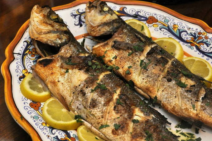 - Haal de vis van het vuur, leg op een schaal en besprenkel met citroen.