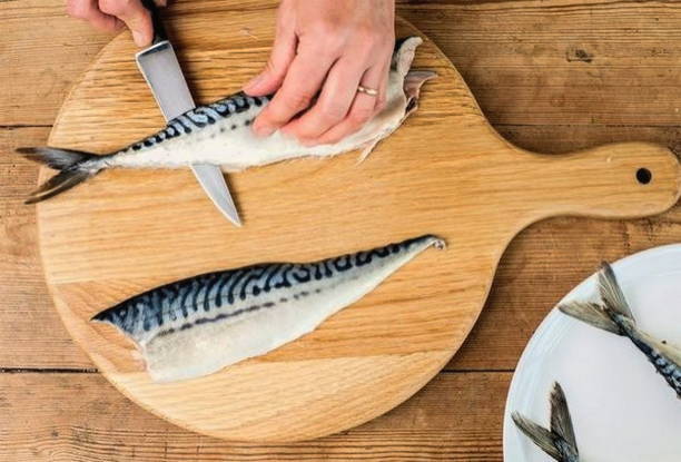 - Maak de karkassen van de vissen los van de vinnen, snij de kop en staart af, maak de ingewanden en films schoon, spoel goed en maak sneden in de huid.