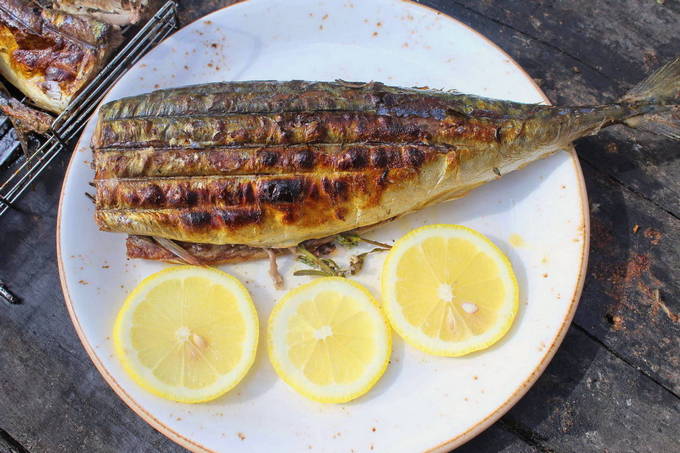 - Bak makreelkarkassen op houtskool 8-10 minuten aan elke kant. Serveer met groenten en pitabroodje.