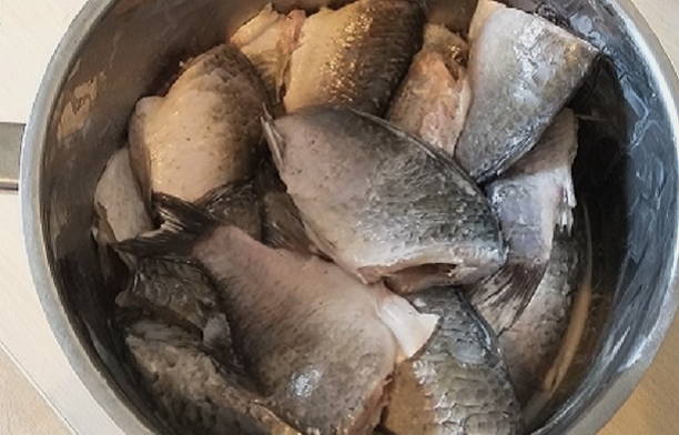 - Snijd de viskarkassen langs de buik, haal de binnenkant eruit, verwijder schubben en vinnen, was goed van binnen en van buiten. Maak sneden in de huid van karpers en kroeskarpers. Kruid de vis met peper en zout.