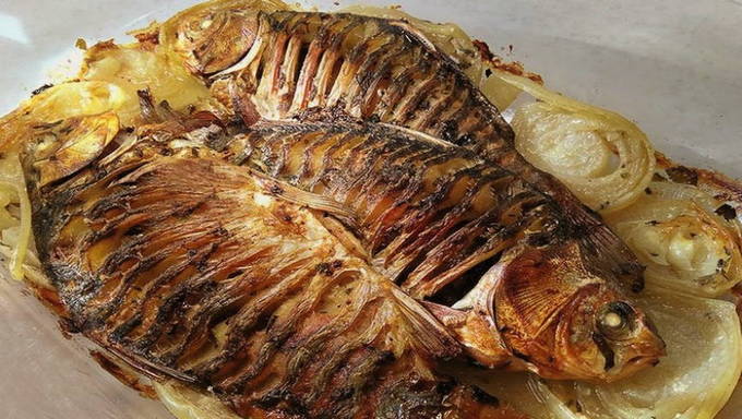 - Snijd op houtskool gebakken karper in porties en serveer met pap of groenten.