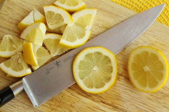 - Snijd de citroen doormidden, vervolgens in halve ringen en leg ze in de sneden op de huid van de vis.