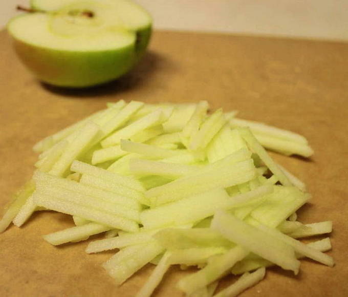 - Schil de appel en snij hem in kleine reepjes samen met de ui, kruid, besprenkel met citroensap en doe de ui en appel in de karper. Zet de buik vast met tandenstokers of knoop hem vast met een draad zodat de vulling er niet uit valt.