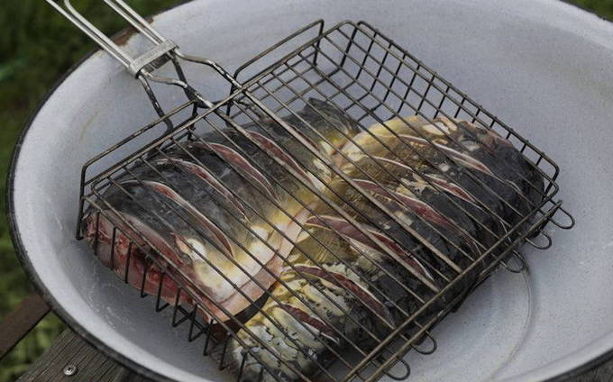 - Vet de grillgrill in met plantaardige olie, leg de vis erop en kook 20-25 minuten op houtskool, regelmatig draaiend, tot er een mooie korst op de vis ontstaat.